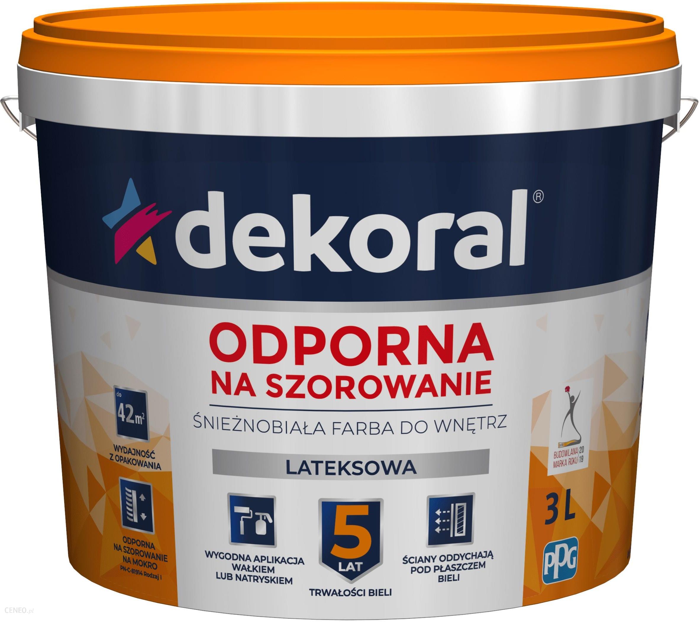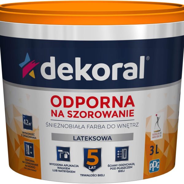 DEKORAL Farba lateksowa Akrylit W BiałaODPORNA NA SZOROWANIE LATEKSOWA FARBA DO WNĘTRZ_Pojemność: 3L | Wydajność: 14m2/l | Kolor: Śnieżnobiały_NAJWAŻNIEJSZE CECHY:Wysoka wydajność – do 14 m² z litraSuper krycieDługotrwały efekt kolorowych ścianOdporna na szorowanie, lateksowaWydajność z opakowania 35m²/2,5 L lub 70m²/5 LUmożliwia prawidłowe „oddychanie” ścianWygląd powłoki: matIlość wartsw: 2Nanoszenie drugiej warstwy: po 2hSposób nanoszenia: Wałek, pędzel płaski, pistoletWydajność przy jednej warstwie: do 14m2/l