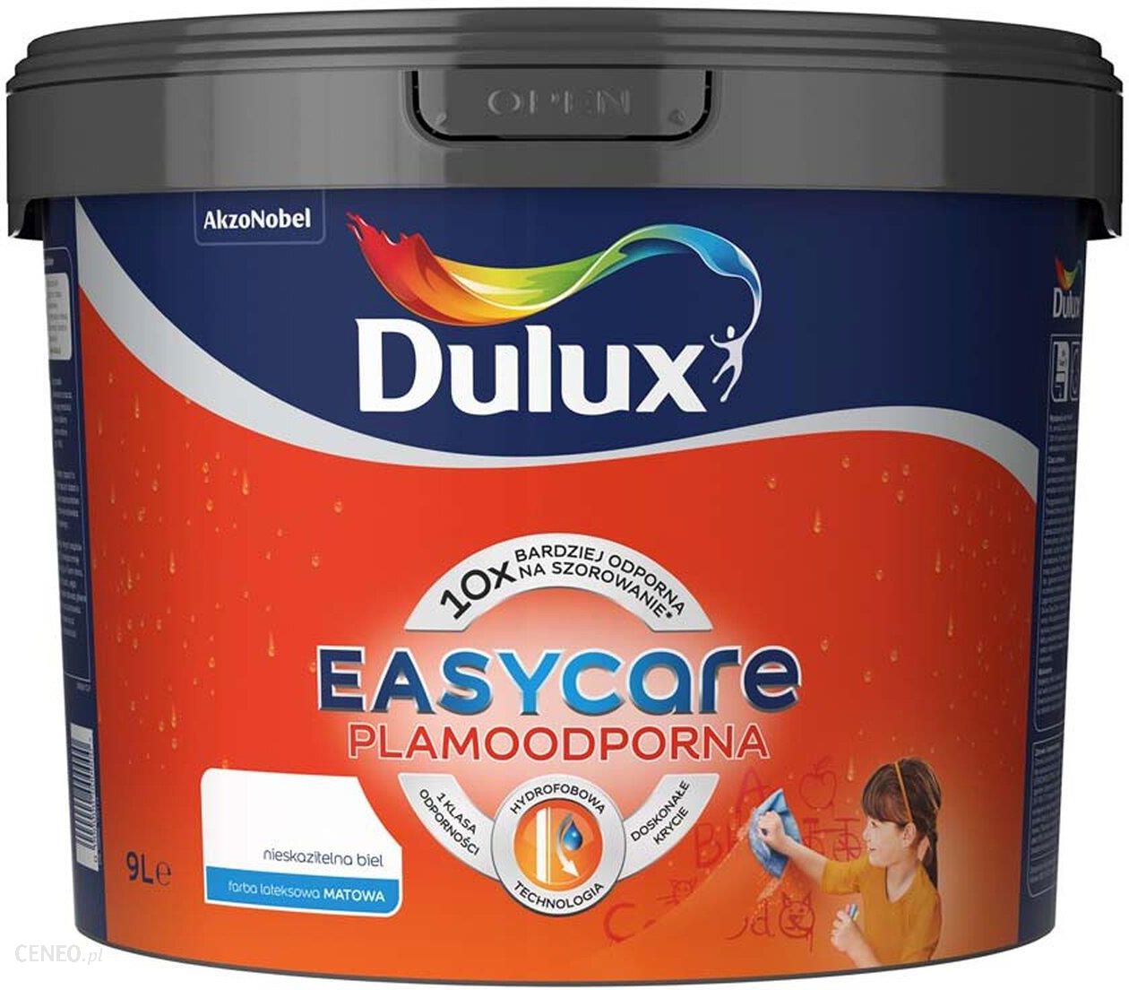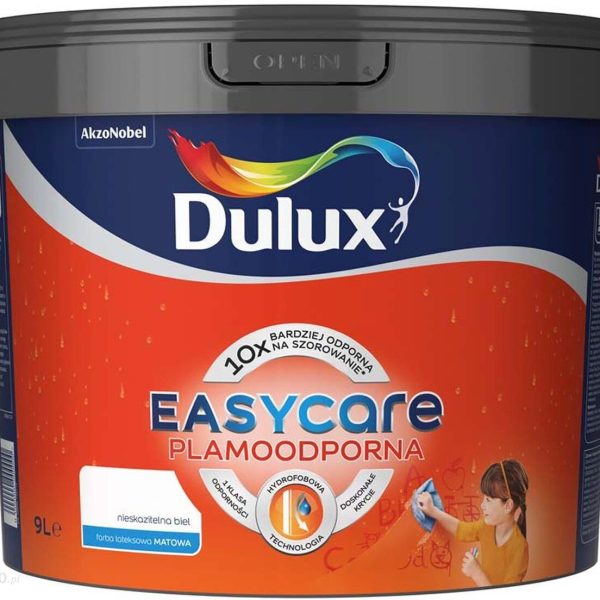 OpisDulux EasyCare to pierwsza na rynku plamoodporna farba wewnętrzna do ścian i sufitów o rewolucyjnych właściwościach hydrofobowych. Dzięki specjalnej powłoce farba odpycha wodę oraz wszelkie płynne zabrudzenia nie pozwalając im przeniknąć w głąb powierzchni. Tworzy matowe powłoki o najwyższej odporności na plamy, a ich usuwanie jest dziecinnie łatwe.