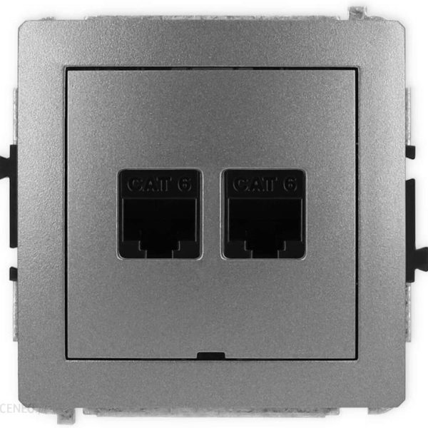 Gniazdo komputerowe podwójne RJ45 kat.6 w kolorze grafitowym z serii DECO, marki Karlik.Gniazdo komputerowe (RJ45) podwójne przeznaczone do podłączenia dwóch kabli sygnałowych kategorii 6 (UTP) typu skrętka (internet). Do kompletu wymagana ramka. Można stosować do systemów ramkowych wielokrotnych.Kategoria 6 jest obecnie stosowana przez użytkowników, którzy wymagają szybkiej transmisji danych do zwykłych zastosowań domowych i biznesowych.