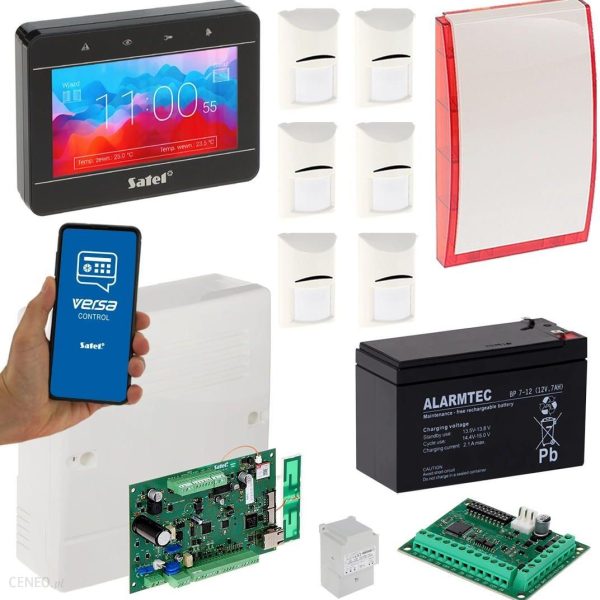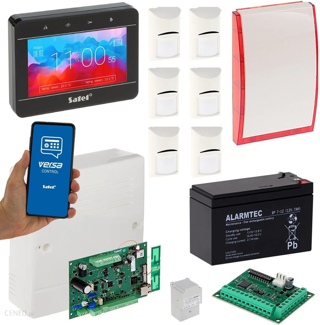 Zestaw alarmowy zawiera:1x centrala Satel VERSA-PLUS;1x antena Satel ANT-GSM-I;1x obudowa plastikowa natynkowa Satel OPU-4 P;1x transformator TR-40VA;1x akumulator bezobsługowy 12V/7AH ALARMTEC;1x ekspander wejść Satel INT-E;1x przewodowy manipulator Satel INT-TSG2-B (kolor czarny);6x przewodowa, wewnętrzna czujka ruchu Bosch Gen2 ISC-BPR2-W12;1x przewodowy, zewnętrzny optyczno-akustyczny sygnalizator Satel SP-4001 R;akcesoria do centrali (kołki montażowe, rezystory, bateria, przewód do akumulatora);