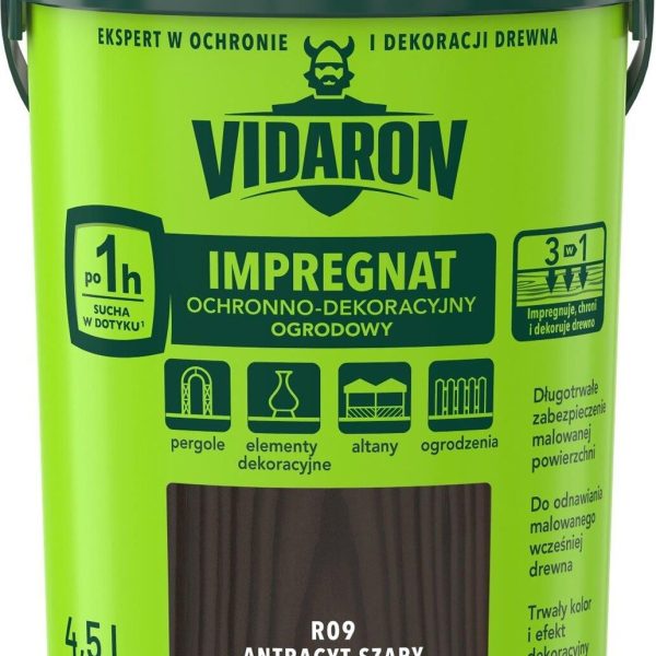 Impregnat ogrodowy antracyt szary 4,5 l, marki Vidaron.Impregnat Ochronno – Dekoracyjny Ogrodowy to produkt, który impregnuje, chroni i dekoruje drewno. Dodatkowo impregnat długotrwale zabezpiecza malowaną powierzchnię oraz zapewnia trwały kolor i efekt dekoracyjny. Charakteryzuje się wczesną odpornością malowanej powierzchni na deszcz oraz szybkim wysychaniem – powierzchnia sucha w dotyku już po 1 h.
